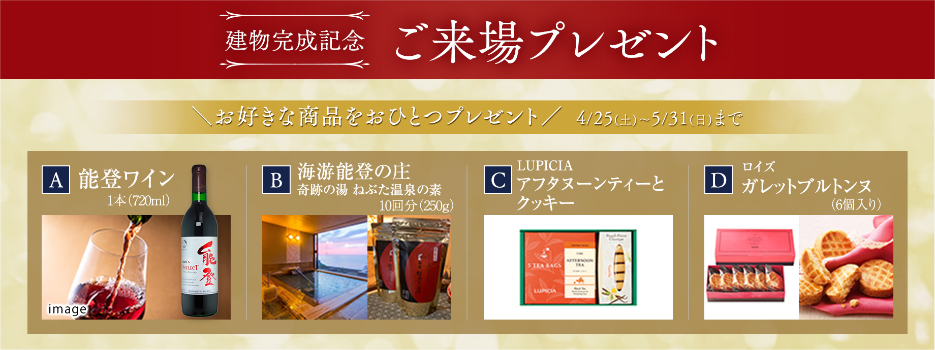 ※モデルルームをご見学、アンケートにご協力いただいた方に限ります。1世帯様(1組様)1回限りとなります。未成年・学生の方のみのご来場はご遠慮ください。※商品は先着順となり、無くなり次第終了となります。また、予告なく内容が変更となる場合があります。予めご了承ください。※他のキャンペーンとの併用はできません。※商品は後日郵送となる場合がございます。