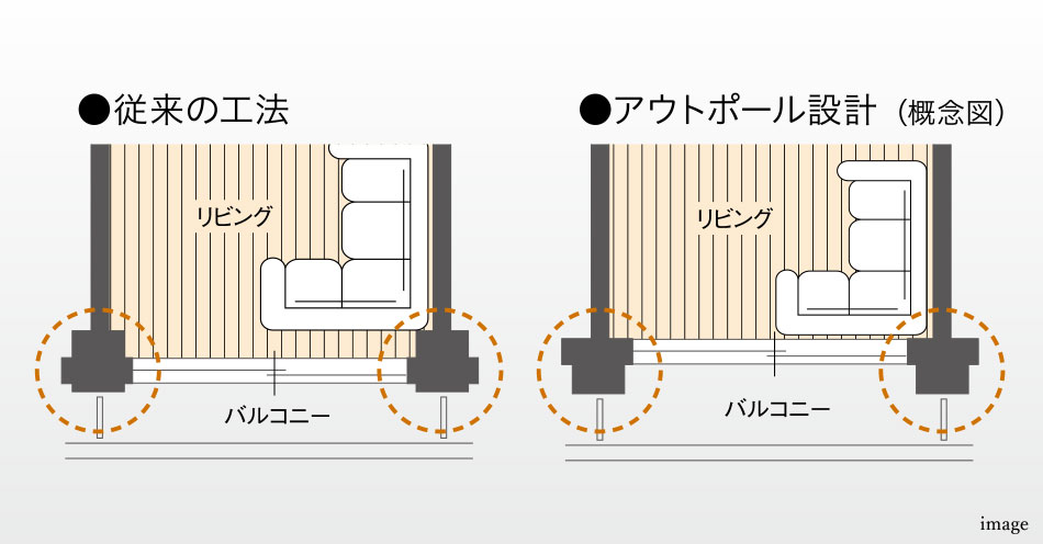 - リビング側に柱を出さずバルコニーなど外側に出す設計を採用。室内に出っ張りがなくなり広く使え、家具などのレイアウトがしやすくなります。(一部除く)