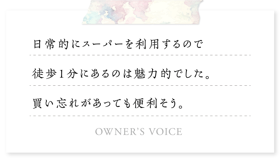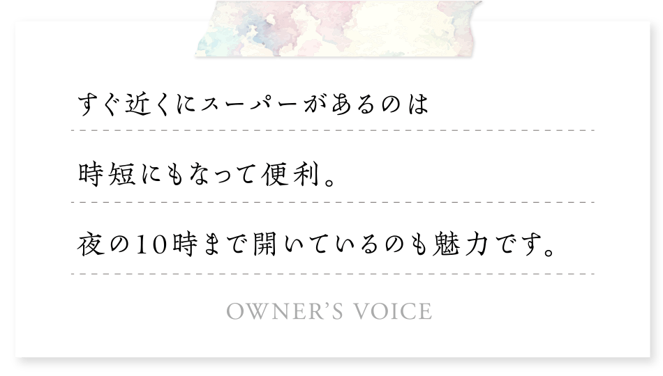 スーパーABCが徒歩1分。思いたったらいつでも気軽に利用できます。スーパーABCでは、無添加、国産、健康、製法などにこだわり、全国から集めた旬の食材や調味料、おかしなど、バイヤーがセレクトした「ABCセレクション」が人気です。