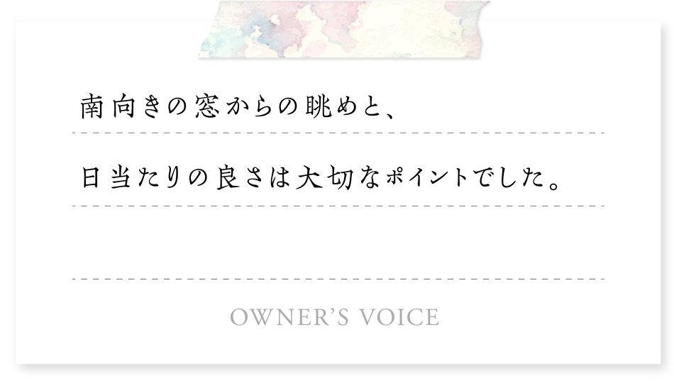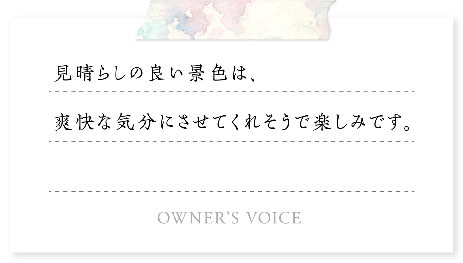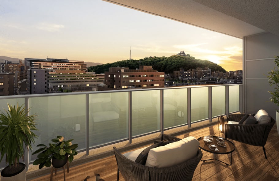 南西に広がるのは、日本三大平山城にも数えられる松山城の景色。四季折々に違った表情で楽しませてくれる城山の潤いと松山のシンボルを背景とする。誇りある風景が、日常の暮らしとともにあります。