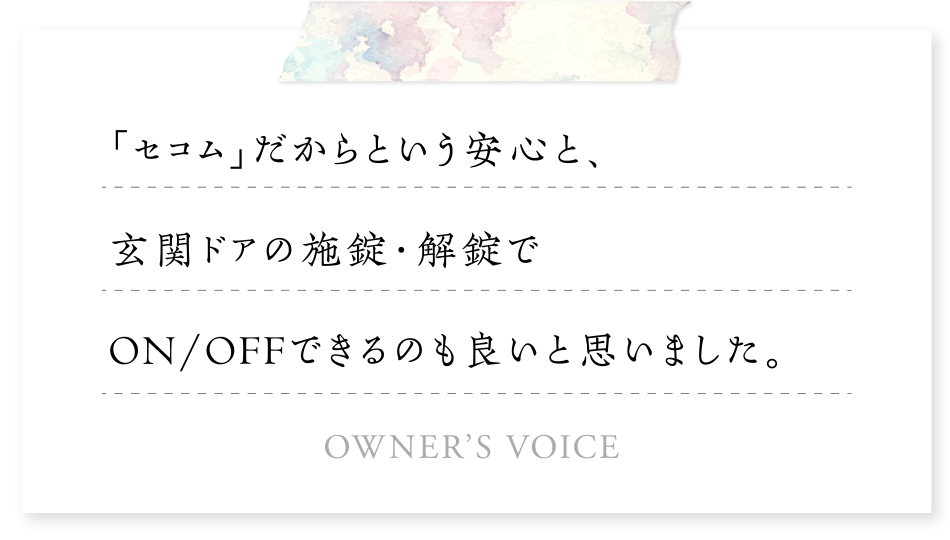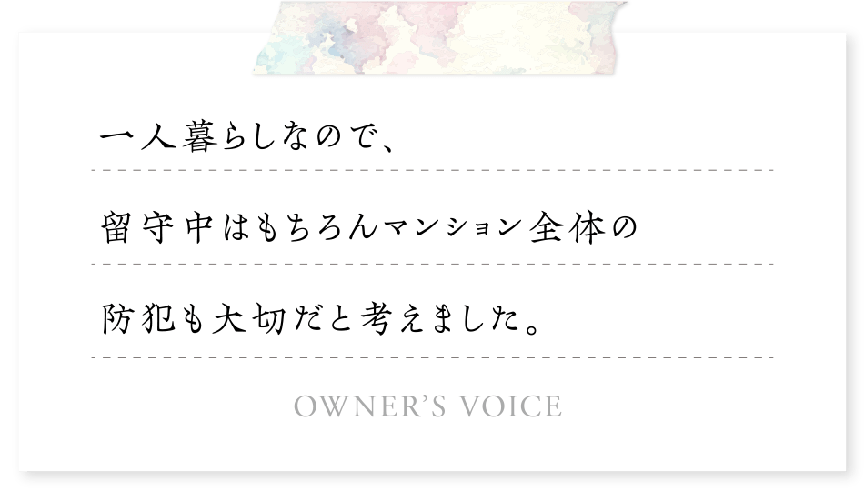 SECOMセキュリティシステムを採用。緊急の際にプロのガードマンが急行し対処します。また、エントランス・エレベーター前・行き先ボタン・住戸玄関の計4ヶ所のロックシステムを採用し、安全性を高めています。