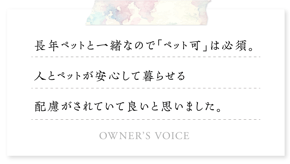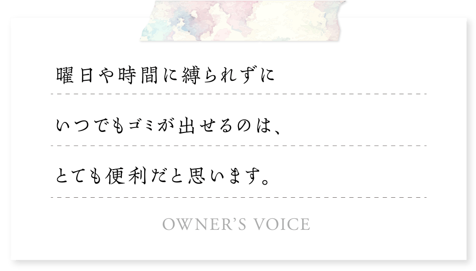それぞれのご家族のライフスタイルに合わせ、回収日や時間を気にせず24時間いつでもゴミを出す事ができます。また、大好きなペットと一緒に暮らすことができ、お散歩後に便利なペットの足洗い場も設けています。